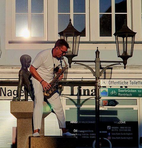 Für sanfte Klänge im Hintergrund sorgte der Saxophonist Dominik Engel, der über Lautsprecher auf der ganzen Festmeile zu hören war. Er lief mit seinem Instrument auf und ab, verweilte zwischendurch immer wieder bei den Gästen. Einen fulminanten Beweis seines Könnens gab er auf dem Gören- und Lausbubenbrunnen stehend gleich zu Beginn der Veranstaltung, was ihm viel Applaus einbrachte.