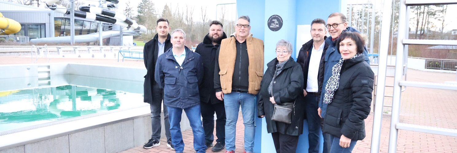 Oberbürgermeister Ulli Meyer, Beigeordneter Markus Schmitt, Ortsvorsteherin Irene Kaiser, der Aufsichtsratsvorsitzende der Bäderbesitzgesellschaft Jeremy Wendel, der Geschäftsführer der Bäderbesitzgesellschaft St. Ingbert Jürgen Bach, Bäderbetriebsleiter Dirk Burger sowie der Betriebsratsvorsitzende der Bäderbetriesbgesellschaft Luca Schmitz enthüllten in einer kleinen Gedenkstunde gemeinsam mit der langjährigen Lebenspartnerin Carmen Preuss die Plakette am Sprungturm zu Ehren von Werner Roth.