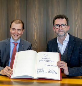 „Ich freue mich, dass du unsere Nöte als Kommune verstehst, wir eine gemeinsame Sprache sprechen und lösungsorientiert zusammenarbeiten“, bedankte sich Oberbürgermeister Dr. Ulli Meyer bei Reinhold Jost, Minister für...